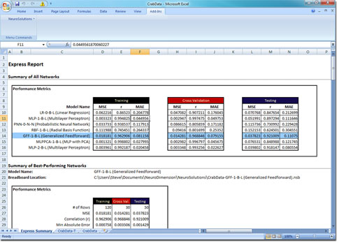 Upon completion, all of the statistics of the training and testing simulations are compiled in a easy-to-read worksheet with the "best" result highlighted for easy retrieval. Inlcuded in the report is a Summary of All Networks, Performance Metrics (e.g. MSE, Min. Abs. Error, etc.) and Confusion Matrices for classification problems.