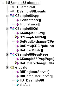 其中,_DSample68和_DSample68Events这两个接口将为客户程序提供本控件的属性、方法以及可能响应的事件。全局函数DllRegisterServer()和DllUnregisterServer()分别用于控件在注册表的注册和注销,一般不需要对其进行改动。