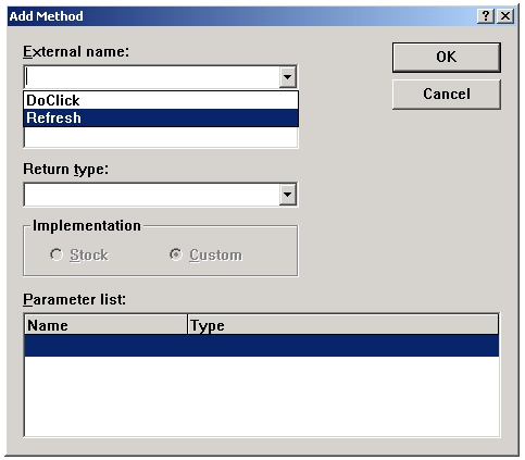 ActiveX控件作为基本的界面单元,必须拥有自己的属性和方法以适合不同特点的程序和向包容器程序提供功能服务,其属性和方法均由自动化服务的IDispatch接口来支持。除了属性和方法外,ActiveX控件还具有区别于自动化服务的一种特性--事件。事件指的是从控件发送给其包容程序的一种通知。与窗口控件通过发送消息通知其拥有者类似,ActiveX控件是通过触发事件来通知其包容器的。事件的触发通常是通过控件包容器提供的IDispatch接口来调用自动化对象的方法来实现的。在设计ActiveX控件时就应当考虑控件可能会发生哪些事件以及包容器程序将会对其中的哪些事件感兴趣并将这些事件包含进来。与自动化服务不同,ActiveX控件的方法、属性和事件均有自定义(custom)和库存(stock)两种不同的类型。自定义的方法和属性也就是是普通的自动化方法和属性,自定义事件则是自己选取名字和Dispatch ID的事件。而所谓的库存方法、属性和事件则是使用了ActiveX控件规定了名字和Dispatch ID的"标准"方法、属性和事件。