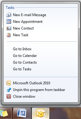 就像Office 2007对Vista特别优化一样,Office 2010已经针对Windows 7的跳转清单功能进行了优化,任务栏上提供了Office相关办公组件的主要功能,例如Outlook的电子邮件,日历,联系人和任务,只要拖动文件到窗格中,就会自动以文件作为附件,任务栏还会显示新电子邮件的信息一起来看图: