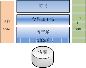 * 猪肉好比Model,无论是哪个厂(层),各个环节传递的本质都是猪肉,猪肉贯穿整个过程。