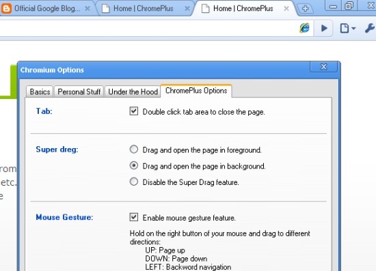 Chromeplus与Chrome类似,不过它添加了几个实用的功能,如鼠标手势,IE TAB,下载软件支持(其中包括迅雷),拖动打开链接,双击关闭标签等。用惯了Firefox的朋友不难发现,这些都是Firefox下常用的扩展,而在 Chrome扩展稀缺的今天,这无疑是一个好消息。详情可以登录Chromeplus网站。同时,对中文用户而言,还有一个好消息,那就是Chromeplus的其中一位开发者是中国人,因此会提供中文版本支持,当然也会添加国内用户常用的功能。