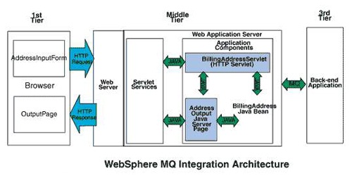 用户填写 HTML 表单。 将表单发送给 servlet。 servlet 将该 HTTP 请求转换成一个 MQSeries 消息,并将其放入一个队列。 后端应用程序处理该消息,然后通过消息队列发回一个应答。 servlet 从队列中检索消息,并将其存放在一个 Java Bean 中。 然后 servlet 调用编译过的 JavaServer Page 并动态生成结果 HTML 页面。 JSP 从 Java Bean 检索该页面的消息内容,将其合并到 HTML,然后将结果页面回显在浏览器上。
