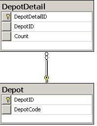 如果为完成某一个特定的业务,需要在程序中使用多次的SubmitChanges方法。比如我们要做一个库存相关业务,该业务是由两张表组成:主表+从表。分别为主表:Depot和从表:DepotDetail 两张表。两张表关系如下: