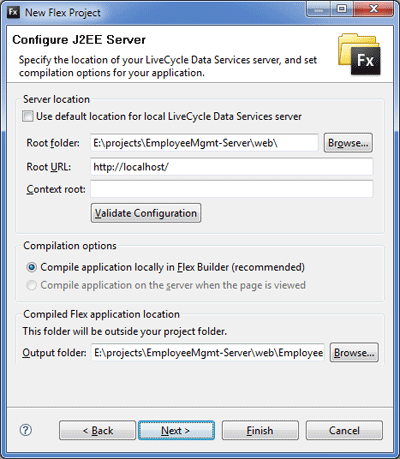 因此,需要填入 EmployeeMgmt-Server 项目的 web 根目录,该目录下必须要存在 /WEB-INF/flex/。点击“Validate Configuration”验证配置文件是否正确,只有通过验证后,才能继续。默认地,Flex Builder 将会把生成的 Flash 文件放到 EmployeeMgmt-Server 项目的 web/EmployeeMgmt-Flex-debug 目录下。