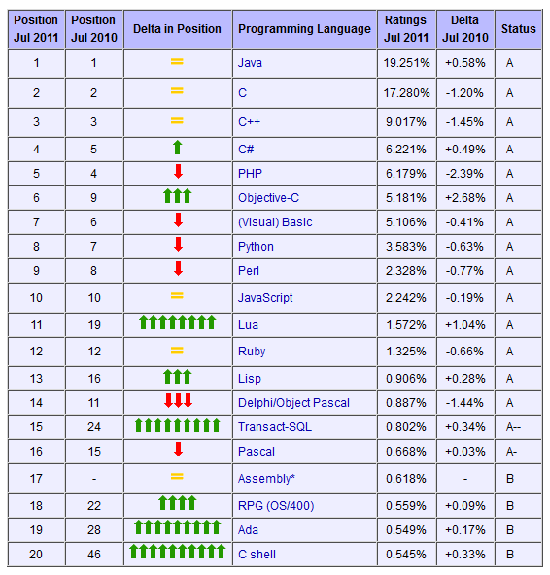 概述:TIOBE公布了2011年7月编程语言排行榜,本期的榜单标题: Objective-C将成为年度语言。前三甲依然是Java、C、C++,4至10名依次为C#、PHP、Objective-C、Visual Basic、Python、Perl、JavaScript。从下图的榜单中可以看出Objective-C和Lua借苹果之势,使用的人也越来越多了。