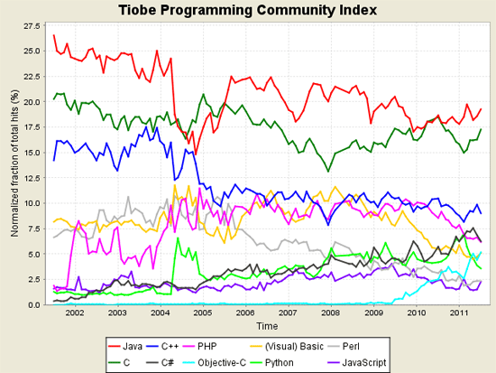 TIOBE公布了2011年7月编程语言排行榜,本期的榜单标题: Objective-C将成为年度语言。