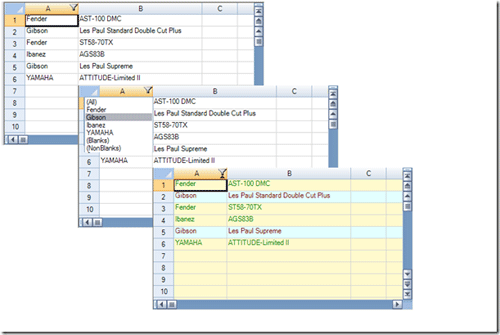 | // 定义应用于筛除行的样式. FarPoint.Win.Spread.NamedStyle inStyle = new FarPoint.Win.Spread.NamedStyle(); FarPoint.Win.Spread.NamedStyle outStyle = new FarPoint.Win.Spread.NamedStyle(); inStyle.BackColor = Color.LightCyan; inStyle.ForeColor = Color.DarkRed; outStyle.BackColor = Color.LemonChiffon; outStyle.ForeColor = Color.Green; // 为第一列创建新的筛选设置(使用默认设置). FarPoint.Win.Spread.FilterColumnDefinition fcdef = new FarPoint.Win.Spread.FilterColumnDefinition(0); // 创建一个StyleRowFilter对象(样式筛选器), 并添加到上述筛选设置中. FarPoint.Win.Spread.StyleRowFilter styleFilter = new FarPoint.Win.Spread.StyleRowFilter(fpSpread1.ActiveSheet, inStyle, outStyle); styleFilter.AddColumn(fcdef); // 为表单设置已创建的行筛选器对象。 fpSpread1.ActiveSheet.RowFilter = styleFilter; // 以文本对数据区域进行筛选。 fpSpread1.ActiveSheet.DefaultStyle.CellType = new FarPoint.Win.Spread.CellType.TextCellType(); fpSpread1.ActiveSheet.SetText(0, 0, "Fender"); fpSpread1.ActiveSheet.SetText(1, 0, "Gibson"); fpSpread1.ActiveSheet.SetText(2, 0, "Fender"); fpSpread1.ActiveSheet.SetText(3, 0, "Ibanez"); fpSpread1.ActiveSheet.SetText(4, 0, "Gibson"); fpSpread1.ActiveSheet.SetText(5, 0, "Yamaha"); fpSpread1.ActiveSheet.SetText(0, 1, "AST-100 DMC"); fpSpread1.ActiveSheet.SetText(1, 1, "Les Paul Standard Double Cut Plus"); fpSpread1.ActiveSheet.SetText(2, 1, "ST58-70TX"); fpSpread1.ActiveSheet.SetText(3, 1, "AGS83B"); fpSpread1.ActiveSheet.SetText(4, 1, "Les Paul Supreme"); fpSpread1.ActiveSheet.SetColumnWidth(0, 90); fpSpread1.ActiveSheet.SetColumnWidth(1, 210); |