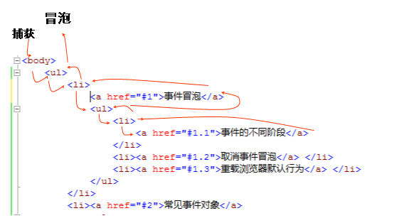 如下图的Dom结构中如果指向锚点#1.1的链接被点击,则依次会触发document > body > ul > li > ul > li > a 的Click处理函数。至此完成捕获阶段。当这阶段完成,开始冒泡阶段,如图中向上箭头的顺序。事件处理函数全部触发。有兴趣可以移步,可以看到动态的过程。