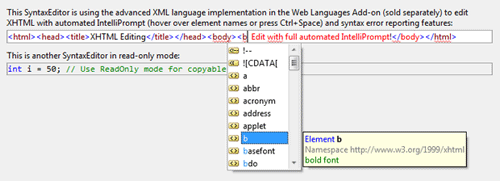 在上面的编辑器,我们在网络语言附加中使用了先进的XML语言。你可以看到我是如何开始键入新的标签,并且我还使用的syntax语法高亮和自动IntelliPrompt,就像在一个正常的多行SyntaxEditor控制一样。并且在编辑器中也出现了波浪线,这说明有语法错误。