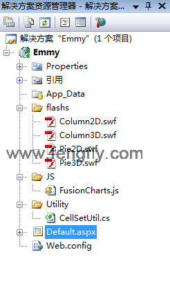 (2)接着,我们新建一个ASP.NET项目,并将相关flash文件、js文件加入到解决方案中,并将CellSet转DataTable的方法写入到一个工具类中,并添加对ADOMD.NET的引用,如下图所示: