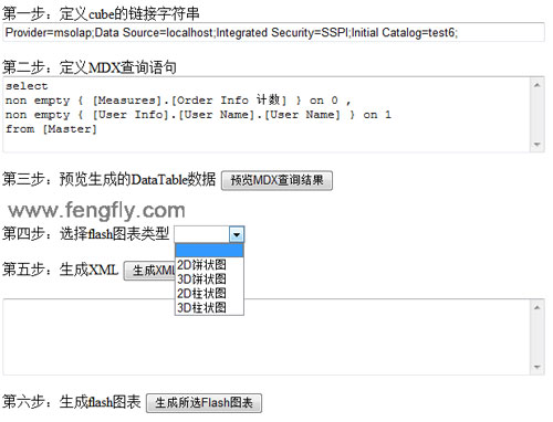 Fusioncharts是一个基于Flash的图表组件,可以用来提供数据驱动的动态图标 。充分利用流体美丽的Flash为模板,使用XML作为其数据接口,创造紧凑,互动的动态图表。而如果要将其应用到我们的BI项目中,需要考虑的问题还是很多的。首先,我们知道,因为FusionChart是基于flash来展示数据的,它的数据源只能是一定格式的xml文件,而且可能每一种图表所需要的xml文件格式不一样。可喜的是,我们可以将数据集转化为xml以提供其数据源。可是,我们知道,在ADOMD.NET中,用MDX语句查询后能获取的对象只能是CellSet,并不是DataSet或DataTable。因此,问题的关键就在于如何将CellSet对象转化为DataTable对象。