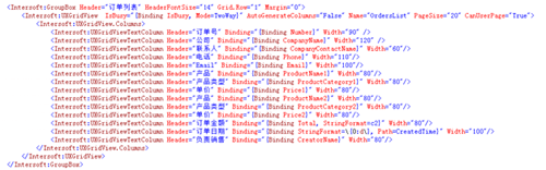 EVCombo for Silverlight控件包提供了丰富的界面控件,包括用于数据呈现的Grid以及用于数据编辑的各种编辑器。我们只需将所需的控件从工具箱中拖拽到相应的界面即可。比如我们要实现订单数据的呈现,我们只需在页面中UXGridView控件,并对其添加所要显示的列并设置Binding属性实现数据的绑定,如下图所示:
