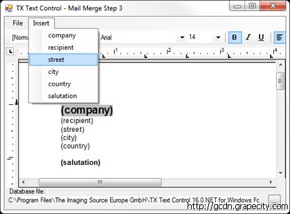 第一和第二步中包含了必须的文本域,为了创建更灵活的文件,应用程序应该提供给用户选择数据库字段的功能,由用户来决定将哪些字段添加到模板文档中。在程序中添加一个【Insert】菜单,菜单包含数据源中的所有列: