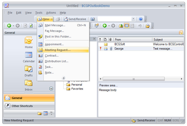 概述:本示例演示了使用BCGControlBar如何创建一个模拟微软Office Outlook的应用程序。
