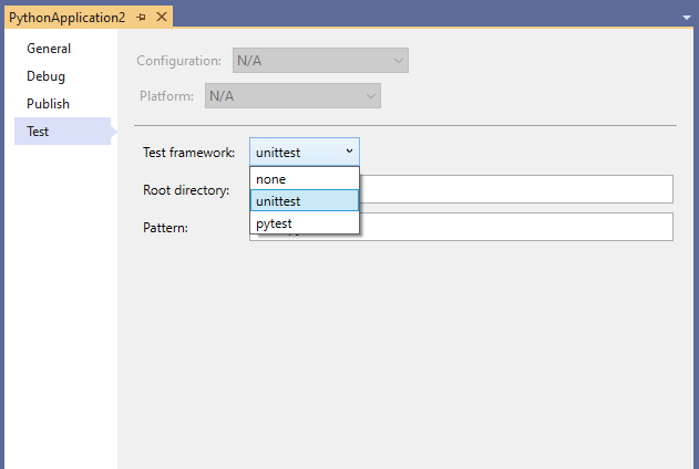 要在Visual Studio中为Python项目启用测试体验,右键单击项目名称并选择“属性”选项。该选项打开项目设计器,允许您通过进入“Test”选项卡来配置测试。从“测试”选项卡中,只需单击“测试框架”下拉框以选择要使用的测试框架,如以下屏幕快照所示: