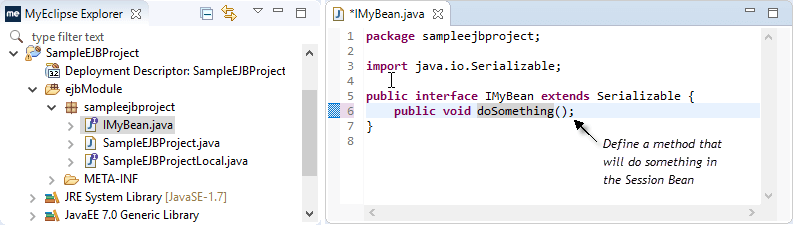 MyBean接口在Java编辑器中自动打开。添加一个方法签名public void doSomething(); ,然后按Ctrl + S保存。