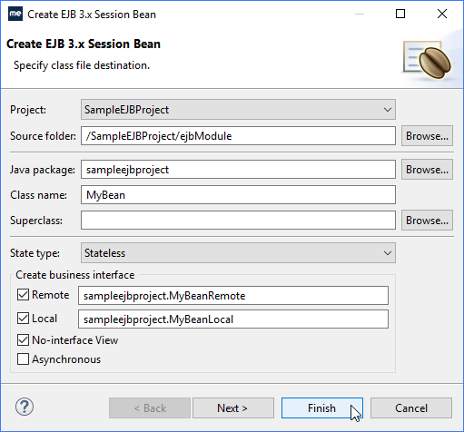 在“Name”字段中输入MyBean,选择“Remote”和“Local”复选框生成本地和远程接口版本,然后单击“Finish”。