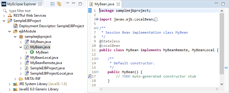 }另外,每个接口都需要扩展IMyBean。打开MyBeanLocal.java和MyBeanRemote.java并添加扩展IMyBean到公共接口。下面是MyBeanLocal的一个例子: