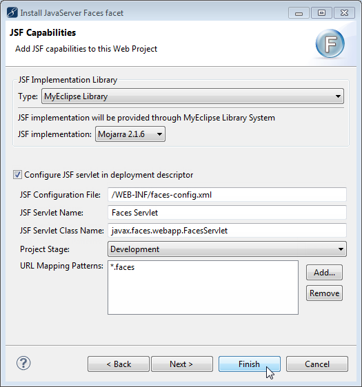 右键单击项目,然后选择MyEclipse > Project Facets > Install JavaServer Faces Facet。