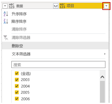 使用Power Query编辑器可以对数据应用筛选器。例如,选择列旁边的下拉箭头将打开文本筛选器清单。清除筛选器后,可以在将数据加载到Power BI之前从模型中删除值。