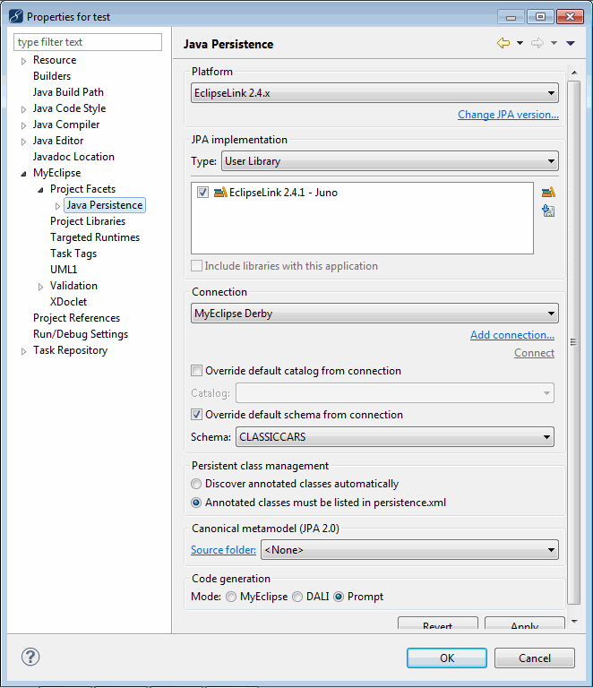 您可以通过创建任意受支持的基础项目类型(例如Java或Web项目)来创建启用JPA的项目,然后从MyEclipse菜单中将JPA构面添加到该项目中。右键单击该项目即可添加JPA构面,然后从菜单中选择MyEclipse > Project Facets > Install JPA Facet。同时,还可以通过打开项目的“Project Facets”属性,同时向项目添加多个构面。