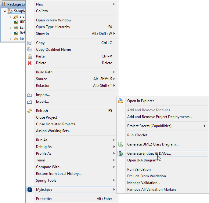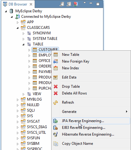 右键单击一个JPA项目,然后从菜单中选择“Generate Entities & DAOs”。您可以选择使用MyEclipse逆向工程工具或DALI实体生成器进行选择,将启动相应的JPA逆向工程向导。