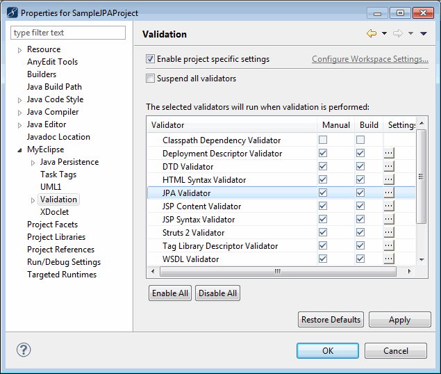 可以在项目级别启用或禁用JPA Entity Validator。