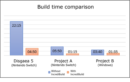 IncrediBuild在其他项目中也给予了我们许多帮助。和‘魔界战记 5’一样,项目A也是一款针对任天堂Switch的游戏作品。一个未采用分布式编译的流程耗时5分50秒,采用IncrediBuild分布式编译后,只需要1分15秒。