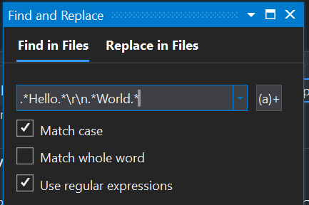 借助Visual Studio 2019版本16.5预览版2,Regular Expression builder将可用。“Use regular expressions”复选框将使您可以将regular expression指定为匹配的模式。使用Visual Studio 2019v16.5预览版2(或更高版本)选中此框还将显示“Regular Expression”构建器,这对于创建Regular Expression很有用。Regular Expression可以允许搜索跨越多行的字符串,例如表达式“.* Hello.*\r\n.*World.*”将匹配任何出现的字符串“Hello”,而在下一行的任何位置都出现了字符串“World”。