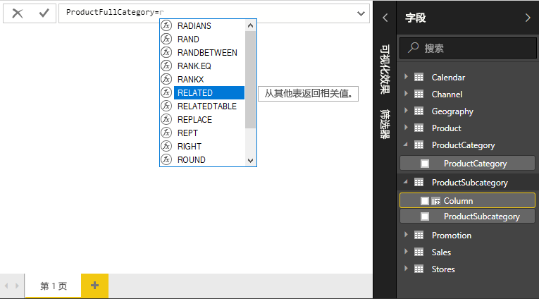 3、若希望新列中的值以ProductCategory名称开始。由于此列在不同但相关的表中,因此可以使用RELATED函数来帮助获得它。