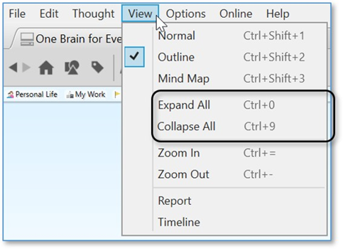 除了在“Outline”视图或“Mind Map”视图中展开和折叠单个“想法”之外,您还可以在所有视图中“展开和折叠”所有想法。