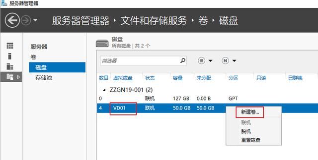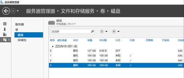 首先登录服务器,打开服务器管理器,进入文件和存储服务—卷—磁盘,可以看到当前的3个数据磁盘。
