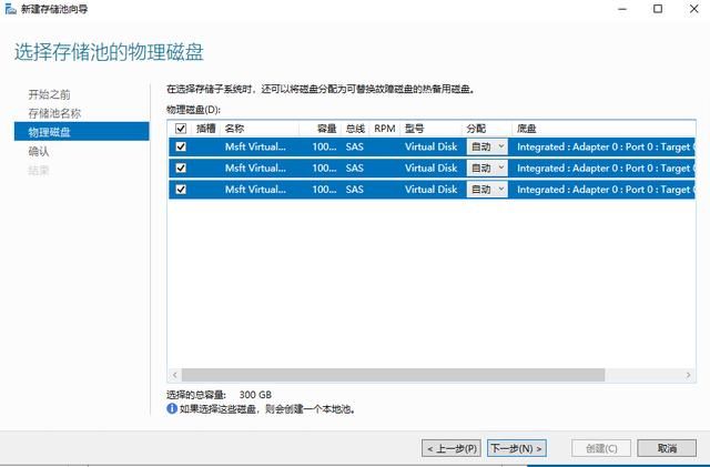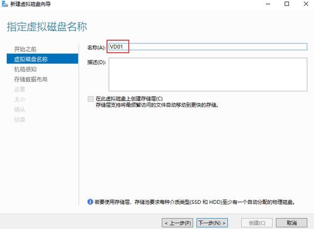 由于是mirror类型,可以看到本来3个100G磁盘组成的存储池可用空间已经变成147G了(正好符合raid1阵列的特性),根据需要指定虚拟磁盘大小:
