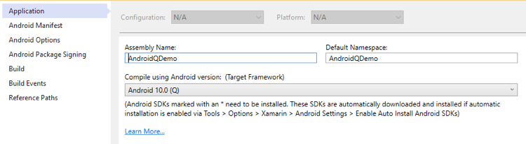 通过在Visual Studio项目属性页的“ 应用程序”选项卡下将Android版本编译为(目标框架)到Android 10.0(Q),开始使用Android Q Preview 。