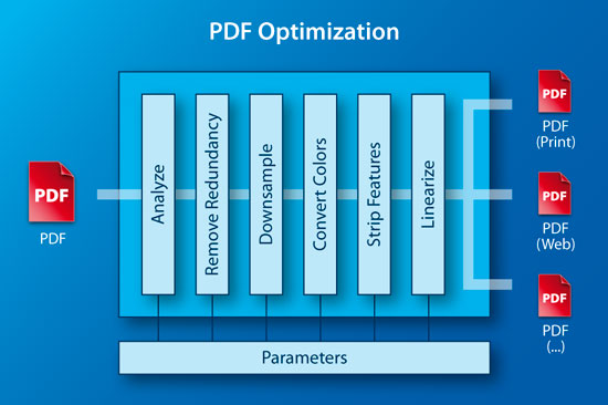 The 3-Heights® PDF Optimizer optimizes PDF files in various aspects. The main application is a PDF compressor, i.e. reduce the file size for electronic document exchange or space-saving document archiving. A combination of various sophisticated features allows for high compression with no or minimum visual quality loss. Another application is to optimize PDF for printing, by merging embedded fonts to reduce the spool file size and apply device specific color space conversion. The PDF Optimizer comes in different variants: as Shell to be used on the command line, as watched folder service and as API to be used with C#, Visual Basic, Java, C/C++.