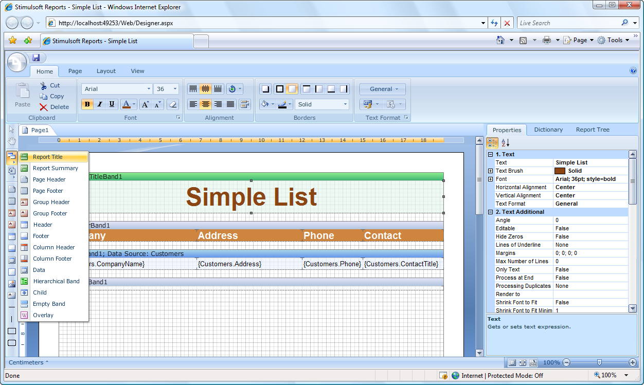 Are you get used to web applications that have limited functionality in comparison with desktop applications? If you use our Stimulsoft Reports Designer.Web – forget about this! Our developers did their best to add all necessary functions which a developer need. The following features are available: fully functional Ribbon interface, visual component builder, undo-redo functions, functions for working with clipboard, tabular editing, zooming, and many other useful functions are available in the product.