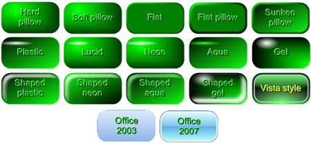 With the latest version of the control, you can now create outstanding 3D buttons having several modern rendering surfaces like Aqua, Gel, Vista's "Aero", Office 2003, Office 2007 and many others: just see below some small surface sample: