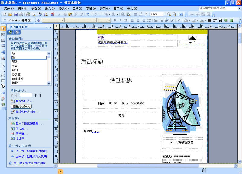 使用 Office Publisher 2007 组合并筛选来自多个源(包括 Office Excel 2007、Office Outlook 2007、Office Outlook 2007 和 Microsoft Office Access 2007)的邮寄列表和数据,以创建个性化的打印材料和电子邮件材料并生成目录和数据表等自定义宣传材料。