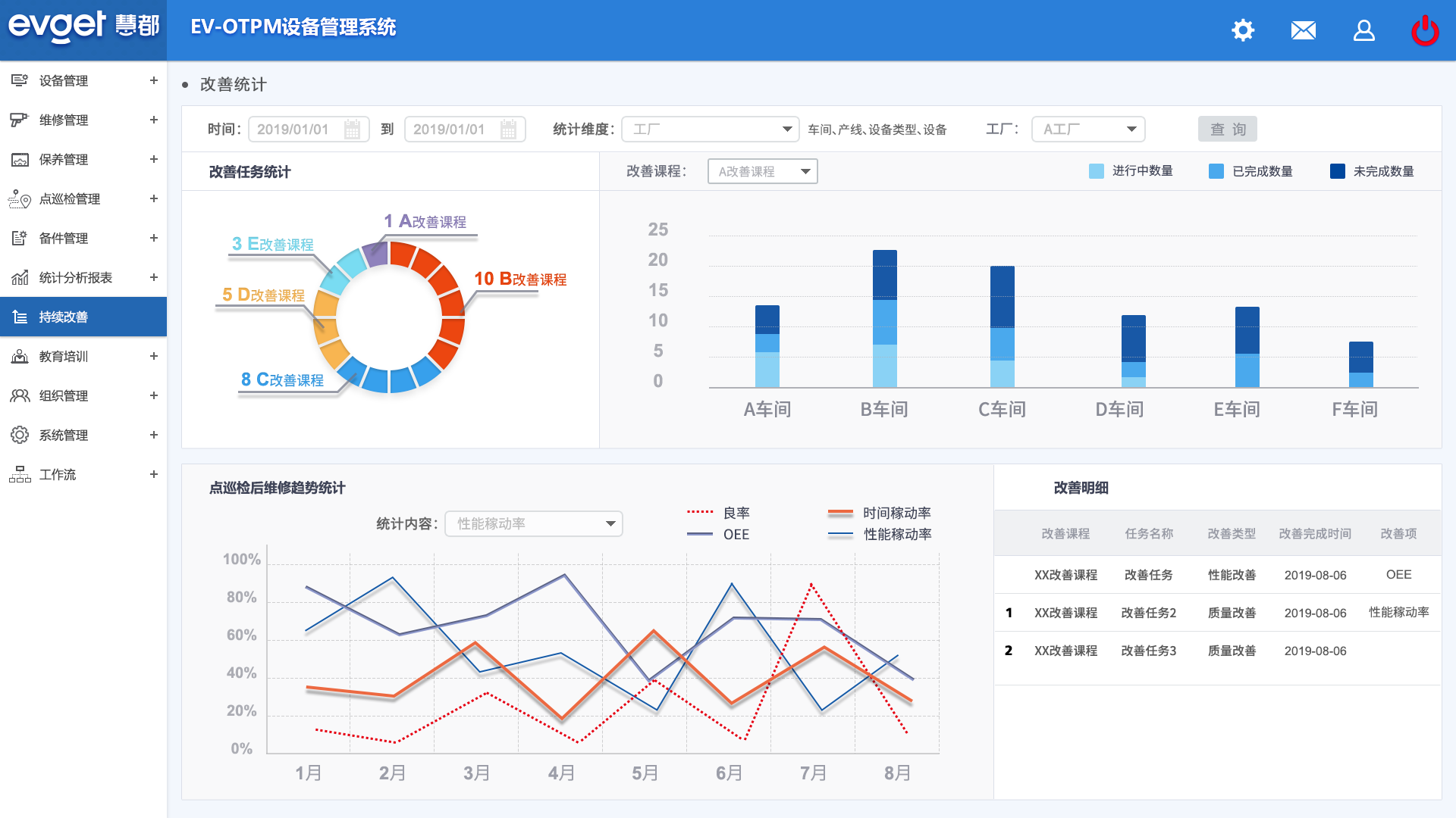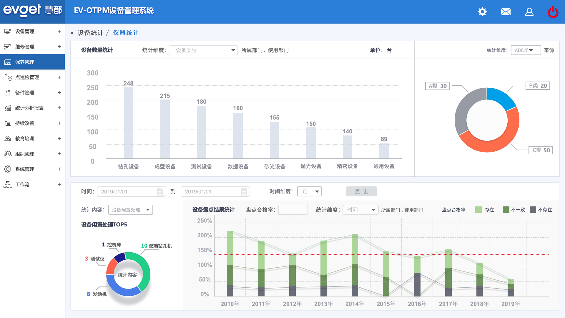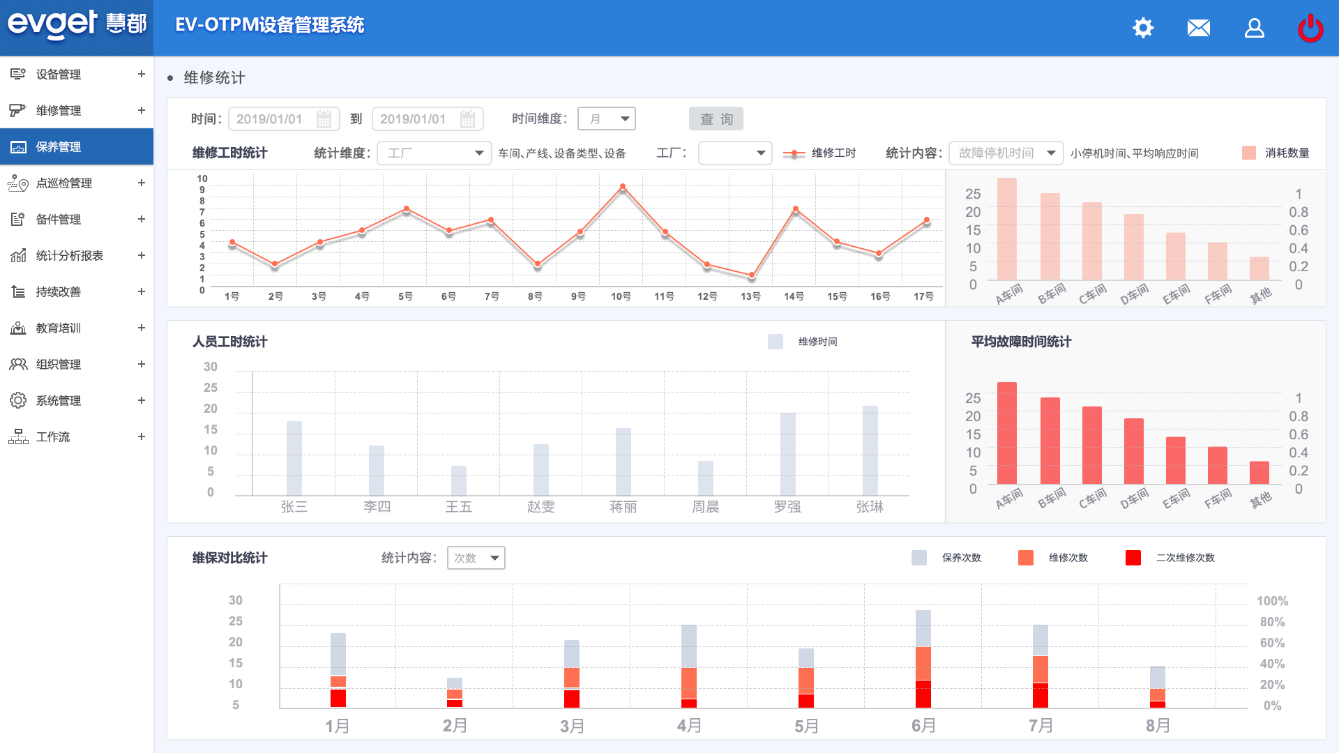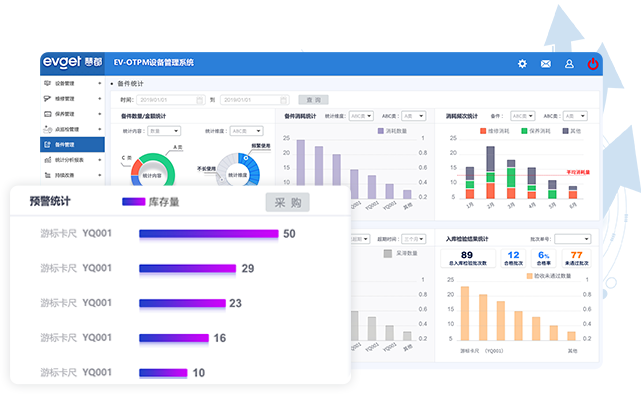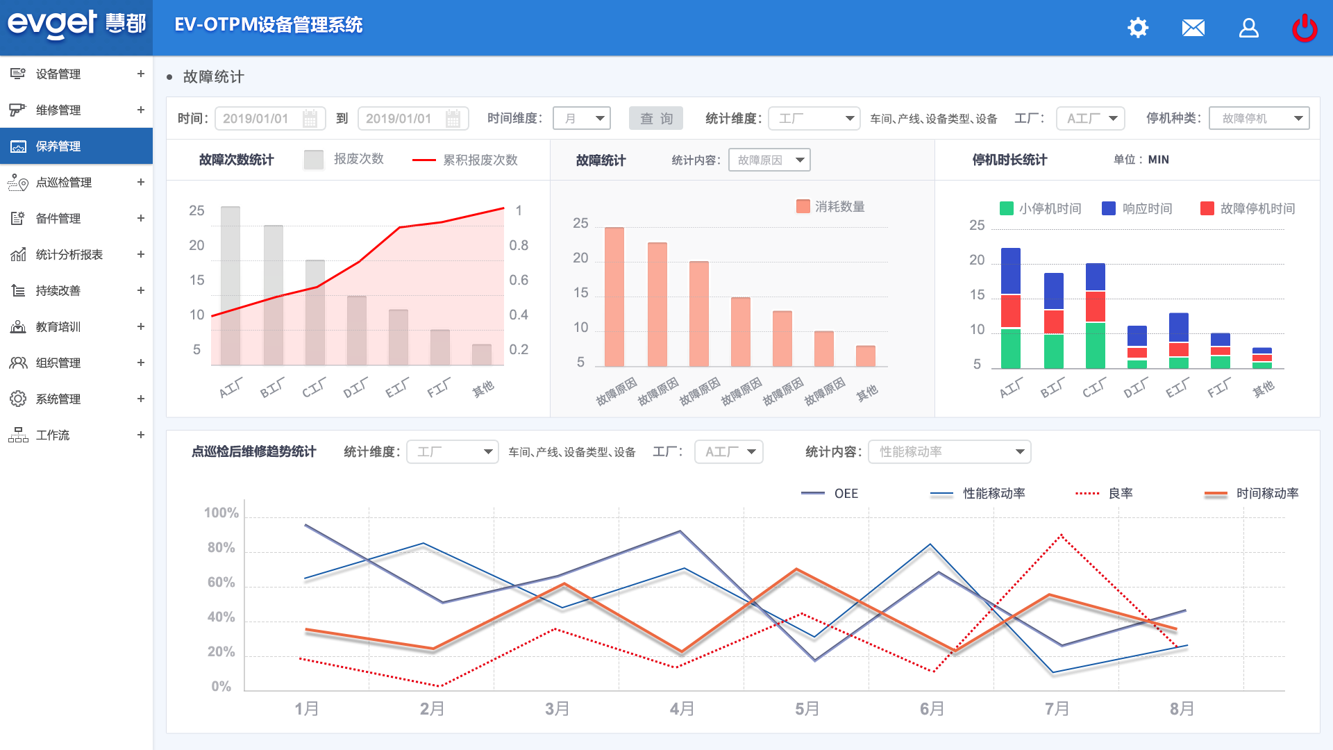 EV-OTPM是慧都科技17年行业经验与技术沉淀之作,以国际ISA95为标准、以六西格玛精益管理为核心理念,打造出一套成熟的轻量化设备管理系统,从购置、台账、保养、点巡检、维修到报废对设备进行全生命周期管理,帮助企业实现设备的规范化、科学化、智能化管理,降低设备故障率、保持设备稳定性、实现设备资源的充分利用。