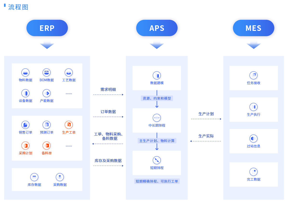 根据人、机、料、法、环等企业资源和产品特性制定出一套合理、高效、可行的排程规则,通过APS系统实现生产计划的高效制定及执行;